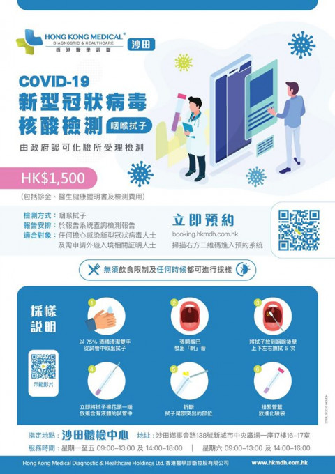 香港醫學診斷 COVID-19 新型冠狀病毒核酸檢測 HK$1,500 在每個工作日下午四時前採集的樣本,報告結果將會在第二個工作日完成及供線上查詢;下午四時後採集的樣本,報告結果將會在第三個工作日完成及供線上查詢 包括診金、檢測費、檢測報告及醫生健康證明書,醫生健康證明書附有「健康碼」,可作過關之用