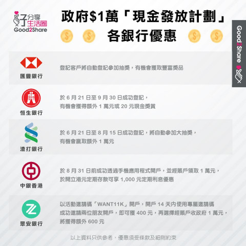 政府現金發放計劃 6 月 21 日開始接受遞交申請,最快 7 月 8 日就可以領取到 1 萬元。市民可以經 21 間參與計劃的銀行的網站及電子銀行登記,或選擇遞交書面登記,可選擇經銀行戶口直接收款,或經香港郵政領取支票。好分享生活圈為大家整理好參與計劃銀行的登記網站,只需按入連結,足不出戶便可登記領取 1 萬元,簡單又方便。