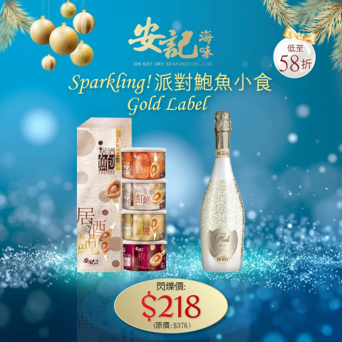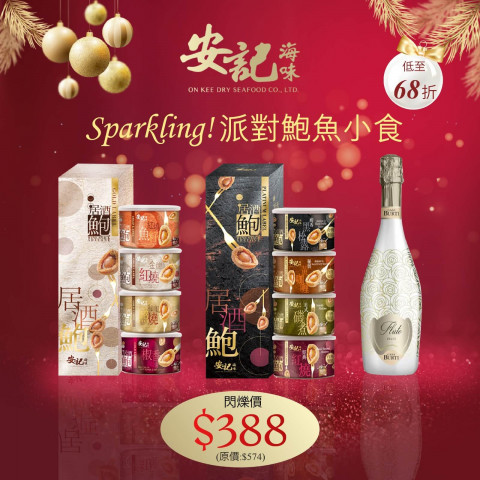安記近日推出派對鮑魚小食套裝,內裡包括一套居酒鮑系列加一支 Casa Burti Flute Dolce ,最適合用作聖誕派對小食,或是作為聖誕禮物送贈給親朋好友。