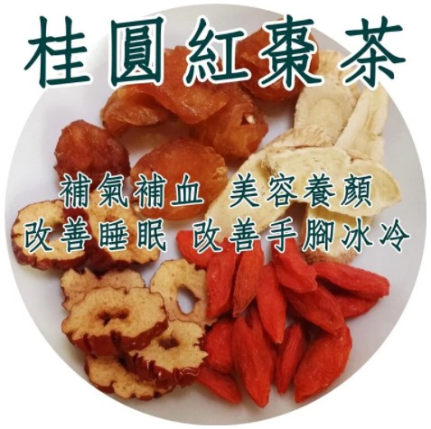 此方有補氣補血,舒緩經痛,改善手腳冰冷作用。醫師建議經前經後飲用桂圓紅棗茶,能幫助帶動血氣到頭部,手腳等離開心臟較遠的地方,以改善來經時頭暈頭痛,手腳冰冷等常見不適。枸杞可以滋補肝腎、明目、潤肺、抗衰老。現代科學證實枸杞茶對於於維護肝臟、增強造血功能、提高免疫力、抗癌、強壯子宮都有幫助。