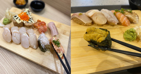 壽司出前位於新開的Food Court,菜式與一般壽司舖相若,分別有有壽司、刺身、手卷、丼飯及烏冬,據聞店主曾經開設高檔omakase餐廳,你在這舖就能享用平民價的omakase,壽司最平是每件9元,也有$108的靚料丼飯。小編點了火炙三文魚、帆立貝、深海池魚、活赤貝壽司及蟹肉蟹膏軍艦,8件200元有找兼吃得飽飽。最有驚喜、最好食竟然是火炙三文魚壽司,燒過的魚肉令魚油迫出來,香噴噴又滑溜,而且只售9蚊,如果不是要留肚,小編絕不介意一口氣食十件!我最愛的帆立貝壽司都值得推介,夠厚身又新鮮,帆立貝身放上點點柚子皮吊味;深海池魚壽司雖然賣相一般,但魚肉好嫩,入口即溶;蟹肉蟹膏軍艦就扣少少分,因為蟹膏份量比較少,基本上吃不到有蟹膏味,原以為它最濃味結果是最淡。丼飯是壽司出前另一得意作品,首先碗大、足料,飯是赤醋飯,不太酸剛剛好,以火炙魚生丼為例,78元有三文魚、魷魚、油甘魚、左口魚、帆立貝及赤蝦,除了厚身,每類有不同烹調方法,赤蝦抹上蒜蓉牛油,炙燒後牛油溶溶地配合香味,真係好正!