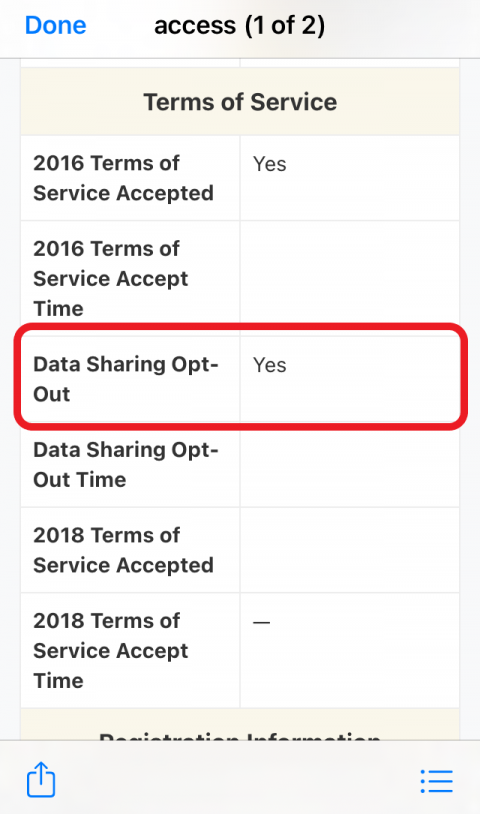 用戶收到的報告,是過去三十日 WhatsApp 帳號的資料,用戶可以檢查 Terms of Service (服務條款) 一欄,看到 Data Sharing Opt-out (宣告退出資訊分享) 的狀態和決定日期。如果是「Yes」,即表示在 2016 年 8 月已經不允許與 Facebook 分享數據。