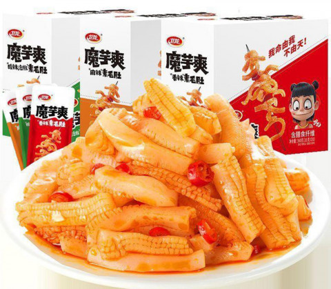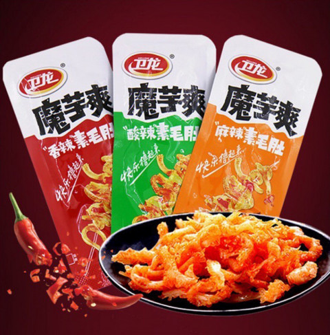 大陸超級受歡迎的品牌,魔芋即是蒟蒻,將它製成類似毛肚的外形,有3種口味:麻辣、酸辣、香辣三款,其實三款都屬中級辣,麻辣是多了些麻、酸辣是較酸、香辣就是純辣。將軟淋淋的蒟蒻變得脆脆,感覺新奇。一盒有20包,真空小包裝讓你忙裡偷閒時吃少少,好快就會食掉一盒,但撕開包盒要小心,提防內裡的汁液噴出。