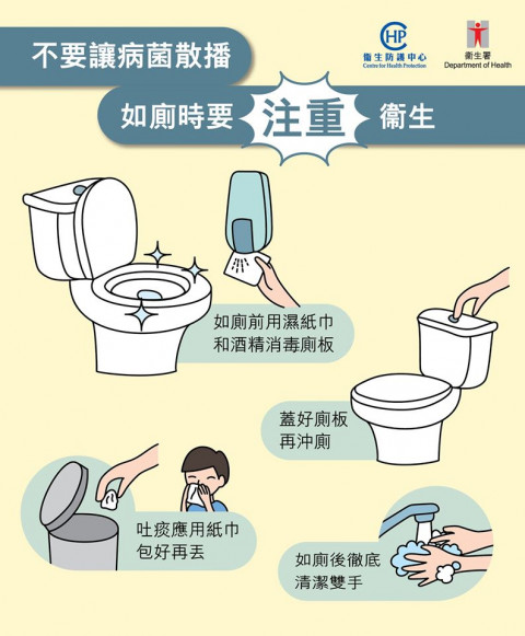 沖廁時的氣流,可以將馬桶內的細菌沖至 6 呎外,打開廁板沖廁,可令身處其中的人和周邊環境受到污染,所以如廁後,一定要蓋好廁板再沖廁。
