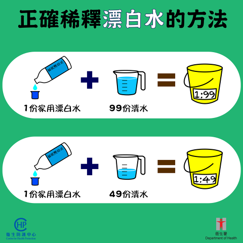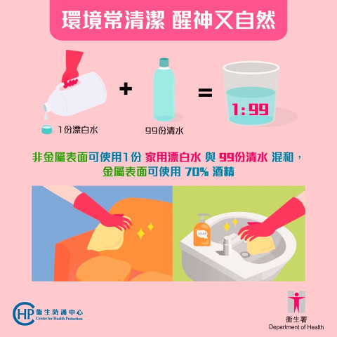 最少每星期徹底清潔家居一次,可使用 1:99 稀釋家用漂白水(以 10 毫升 5.25% 次氯酸鈉家用漂白水混和於 990 毫升清水內)清洗非金屬表面,待 15 至 30 分鐘後,再用清水清洗,金屬表面則可用 70% 火酒清潔消毒。