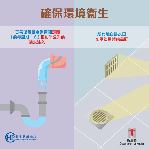 妥善保養排水渠管,定期 (約每星期一次) 把約半公升的清水注入每一排水口 (U型隔氣口) ,以確保環境衛生,所有地台排水口在不使用時應蓋好。衛生防護中心指,樓宇排水管如出現裂縫或損毀,或隔氣彎管乾涸,有可能會令疾病傳播。大部分樓宇的排水管會連接各單位的洗手盆/鋅盆、浴缸/淋浴盆、馬桶和地台排水口,這些衛生設備都各設有隔氣彎管(包括 U 形、樽形或反虹吸隔氣彎管),防止污水管的臭味和昆蟲進入樓宇內。要確保隔氣彎管可發揮其隔氣功能,隔氣彎管內必須有足夠貯水。