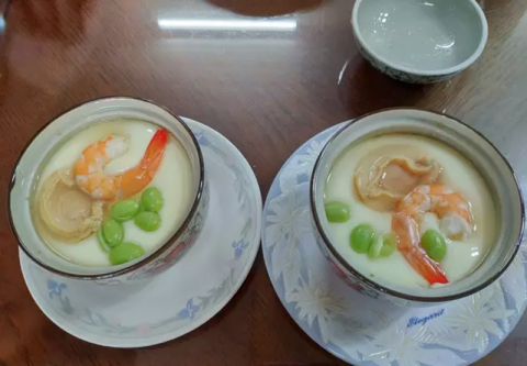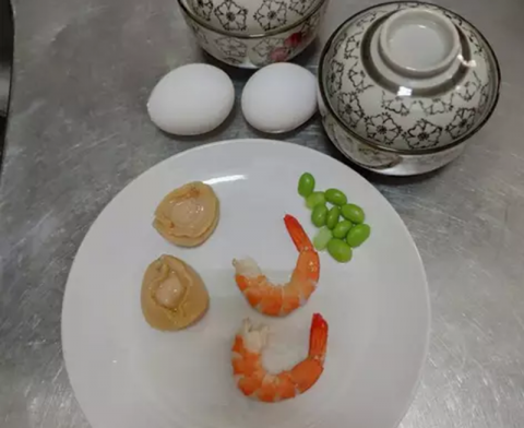 1. 預備材料、蝦去腸後洗乾淨,可以先蒸熟,蛋打散後,連鮑魚、蝦及毛豆放入碗,備用