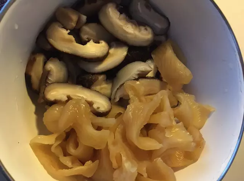 6. 將冬菇、花膠放入煲,加水至浸泡冬菇花膠九成滿。水沸騰後轉中火