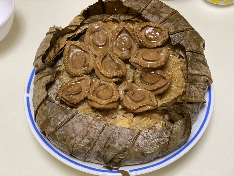 6. 打開荷葉,放上即食鮑魚,淋上鮑魚汁,再蒸約5分鐘