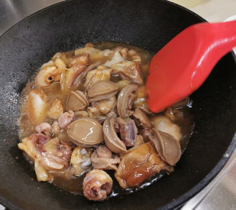 2. 先落油,中大火爆香薑、乾蔥。落雞件平均煎香一會,然後不斷炒,炒至6成熟
