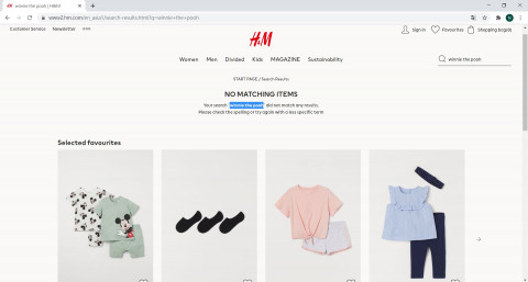 多間國際時裝品牌因關注新疆強制勞役問題,並宣布停用新疆棉,引來部份中國消費者不滿,觸發抵制潮,多個華人地區代言藝人更跟品牌割蓆,單方面宣布解約。其中 H&M 遭抵制後,它在淘寶、天貓等平台的官方帳後都被下架,雖然官網仍然存在,但有人發現,內地早前上架的小熊維尼童裝已經失蹤。而在香港 H&M 的官網,同樣已找不到小熊維尼系列的蹤影,不過到香港的門市,仍可找到部分維尼商品的蹤影,但如果要買其他貨款,就只能到外國版 H&M 網站了。