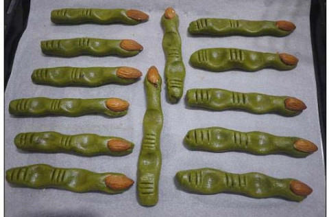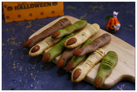 萬聖節,小朋友最怕見到巫婆,但是美味的巫婆手指餅乾就人見人愛,它加入可可粉和抹茶粉就可以做出不同口味的餅乾。雖然看起來相當嚇人,但卻很美味,濃郁的香氣加上杏仁果,讓人忍不住吃完一條接著一條!