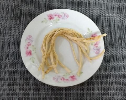 1. 拿好幾條鱈魚魚絲對摺、包住餅乾末端,再拿一條鱈魚魚絲綁起來