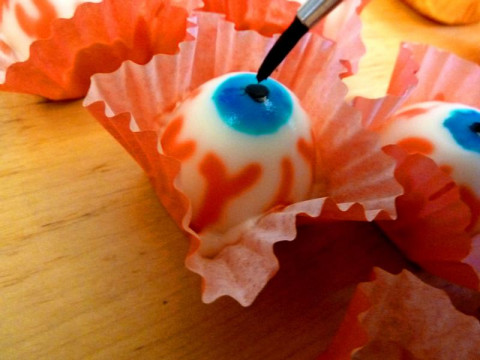 4. 準備一個細小的刷子先沾紅色,在雞蛋上開始沿著中心往外畫出眼球的血管,顏料會自然的流下來到眼周的美奶滋,染成部分的紅色