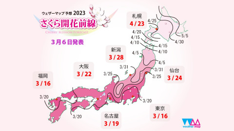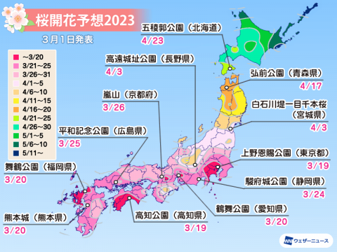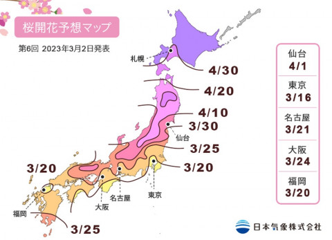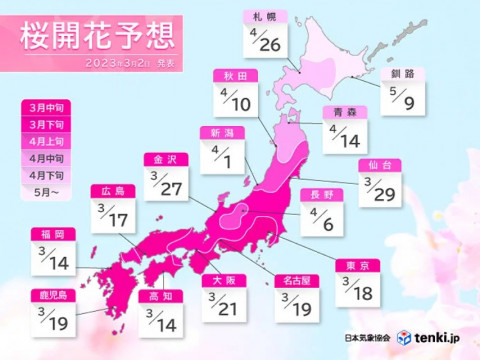 以東京、大阪、京都、名古屋、福岡、札幌、鹿兒島及和歌山等地點來說,於2023年,日本櫻花最先會於3月中開始從東京盛開,至4月末則會開至札幌,想到日本賞櫻朋友,記得要留意!
