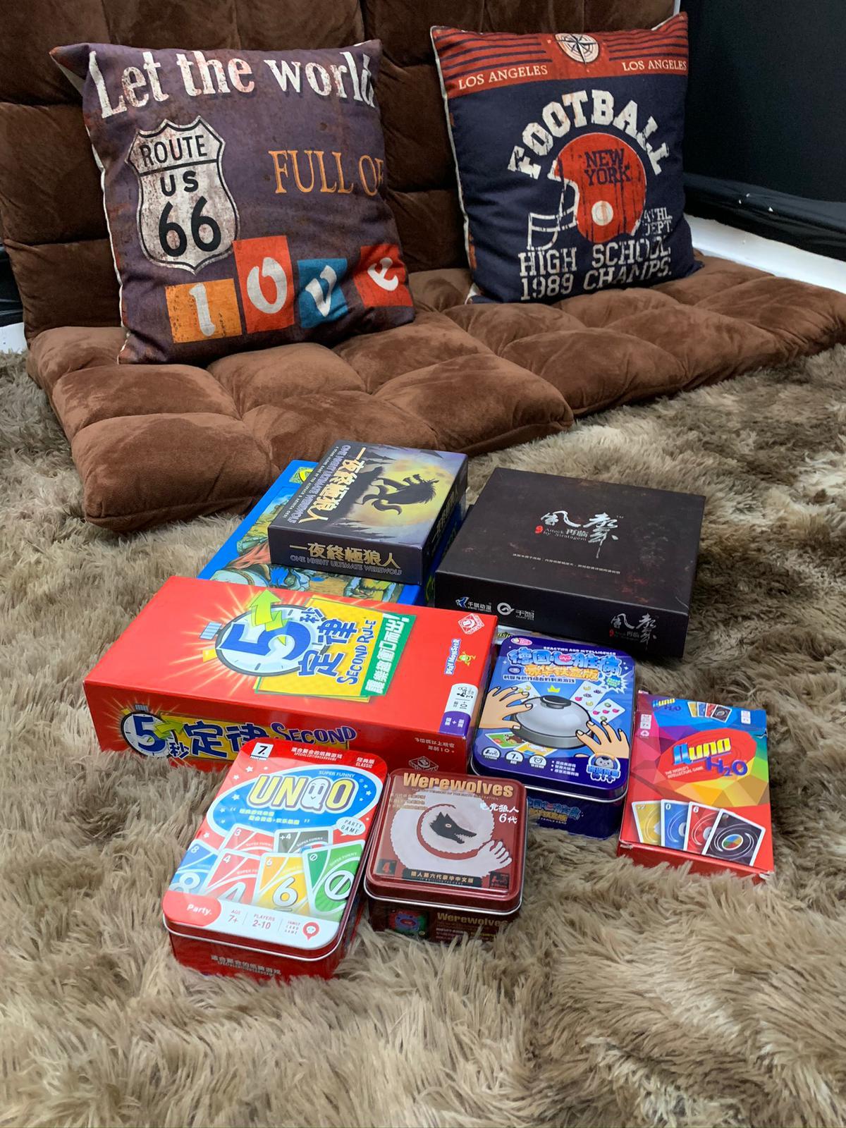 • 場地設備:電視、Switch、桌遊、自動麻雀機、藍芽播放器、卡啦OK設備、WiFi、骰盅、啤牌;
