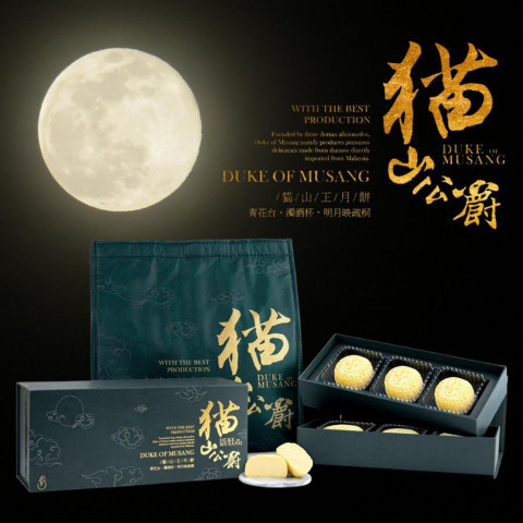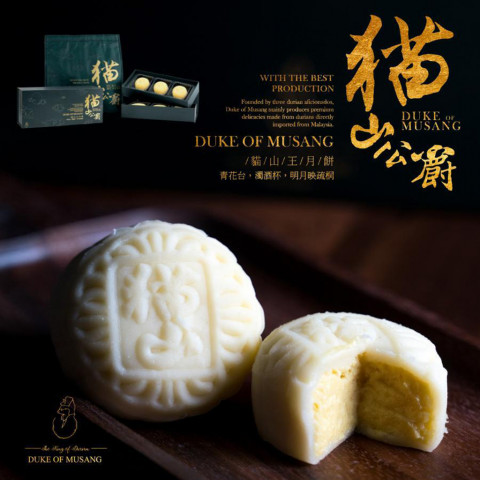 「貓山MUSANG 」其實來自馬來西亞果子狸的譯音, 馬來西亞人將熟透後自然從樹上掉下來但沒有裂開的完整榴槤送到「貓山」面前, 讓牠來聞香,以鑑定優劣。如果「貓山」聞到後興奮不已, 那麼這個榴槤便是極品,被稱作「貓山王」。而貓山公爵是由三位榴槤愛好者精心炮製自家品牌,月餅入面的榴槤果肉,百分百取自貓山王榴槤原肉,果蓉含量接近70%,果肉醇香撲鼻,濃郁香甜,皮薄餡滿,令人齒頰留香,回味無窮,可能是世界上榴槤果蓉含量最高的貓山王榴槤冰皮月餅!每個月餅都是馬來西亞生產,再空運直送香港,產品獲得馬來西亞政府?生證明及出口許可證,安心食用。禮盒設計尊貴顯赫,送禮突顯品味心思,令人難忘。