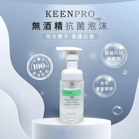 KEENPRO 無酒精抗菌泡沫含有蘆薈精華,徹底消毒雙手同時滋潤肌膚,不含酒精成份,對酒精敏感人士、長者、小朋友及寵物都可使用,亦沒有易燃成份,可安心使用。