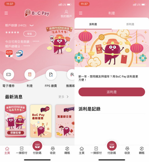 由本月11日至26日新春期內,中銀香港客戶於BoC Pay或手機銀行派發電子利是,即可參加新春「Phone利是」抽獎,有機會贏取$8888現金獎賞,名額共10名。每名客戶於推廣期內派電子利是愈多,獲獎機會愈大,最多可30次抽獎機會。就算不是現中銀香港賬戶,亦可註冊使用BoC Pay,客戶首次綁定或註冊BoC Pay及當月完成交易,可獲高達$20獎賞,而每成功推薦一位親友綁定或註冊BoC Pay,再得$20港元獎賞,推薦越多得到獎賞則越多。與WeChat Pay一樣,收利是者毋需安裝程式,只要有「轉數快」就可以拆利是。