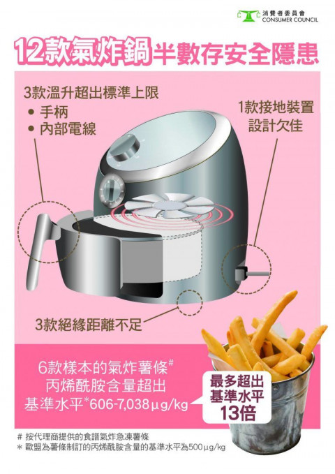 炸薯條、炸雞翼、燒腩仔,要出得廚房上得社交平台外,還要吃得健康。消委會測試了 12 款氣炸鍋,發現半數樣本潛藏安全隱患;雖然氣炸鍋標榜不用添加食油烹調,也能達到油炸食物的效果,但半數樣本的氣炸薯條,所產生的丙烯酰胺含量均超出歐盟基準水平,有機會增加致癌風險。究竟選購或使用氣炸鍋時有什麼要留意?