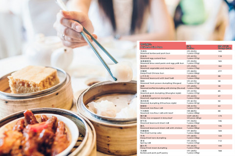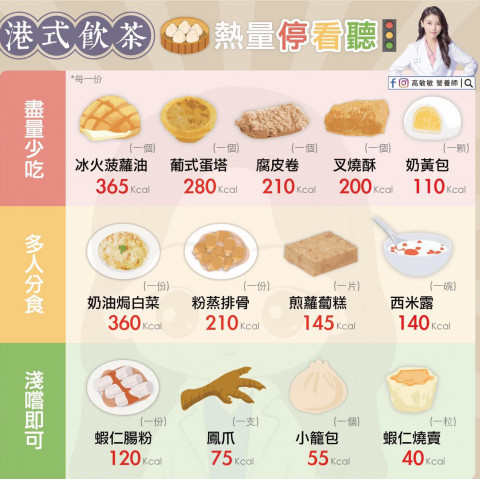 在紅區(熱量最高)的部分,以冰火菠蘿油(一個)365卡路里奪冠,接著依序為,葡式蛋塔(一個)280卡路里、腐皮卷(一個)210卡路里、叉燒酥(一個)200卡路里、奶皇包(一顆)110卡路里;黃區部分則以奶油焗白菜(一份)360卡路里最高、粉蒸排骨(一份)210卡路里、蘿蔔糕(一片)145卡路里、西米露(一碗)140卡路里;最後在綠區部分,包括了蝦仁腸粉(一份)120卡路里、鳳爪(一支)75卡路里、小籠包(一個)55卡路里、蝦仁燒賣(一粒)40卡路里。