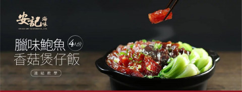 這道「香港仔煲仔飯」用上安記的海龍蝦干、金蠔、泰國魷魚干和銀魚干,先將這四款海味放到清水裡,然後用手輕輕攪拌讓髒東西沉澱,用濾網把撈起,重覆 3 – 4 次後,用清水浸泡約 2 小時,放乾備用。煲仔飯大火煲米 10 分鐘後,轉細火,放入新推出的安記居酒鮑系列 8 隻裝 1 罐,以及蝦干、金蠔、魷魚干、銀魚和臘味碎煮 10 分鐘,熄火不要開蓋焗 15 分鐘收水,一煲有香港海岸風味的「香港仔煲仔飯」即成。