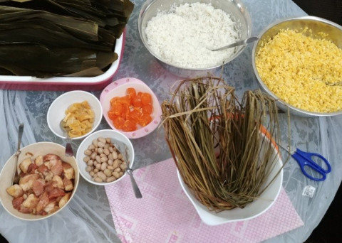 ● 粽葉(洗淨,剪去頭尾,先浸水 1 小時,再烚 15 分鐘) 3 片