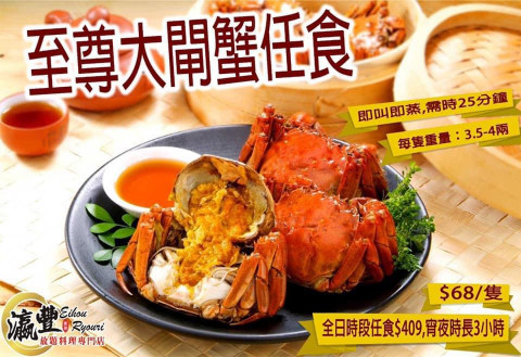 瀛豐放題料理專門店的「至尊大閘蟹放題」,每位 $409 ,就可以兩小時任食三兩半至四兩有膏大閘蟹,還有刺身、泰國料理、燒北海道大元貝和大隻海蝦可供選擇。