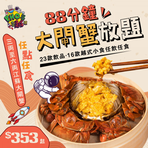 新派越式料理店 Pho 星登陸越球的大閘蟹放題,採用江蘇大閘蟹,設有三至六兩三個重量,每位 $353 起, 88 分鐘任食大閘蟹、越南菜,以及蟹粉小食,例如蟹粉花枝丸、蟹粉水餃、滑嘟嘟蟹粉鴨血和蟹粉粥,每位加 $48 更可以無限飲話梅花雕王、紅白餐酒和啤酒。