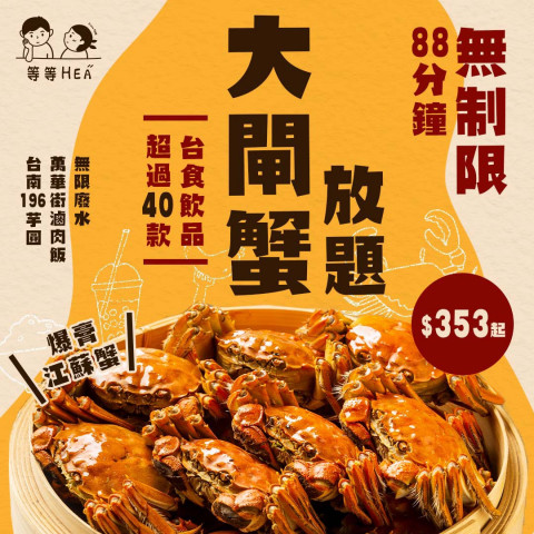 台式餐廳等等 Hea 豪推同樣是推出「88 分鐘無制限大閘蟹台式小食放題」,每位 $353 起任江蘇大閘蟹,價錢以大閘蟹重量劃分,除了有蟹粉花枝丸、台式腸蟹粉糯米飯、一口蟹粉鴨血和生滾大閘蟹粥一類的蟹粉小食任食,還可以品嚐士林鹽酥雞、厚燒鰻魚、萬華街蚵仔滷肉飯、阿等麵線、196 薑茶芋圓、196 花膠鮮奶芋圓等一系列台式小食。廢水 (黑糖珍珠奶茶、奶蓋白桃烏龍茶、菠蘿四季春) 同樣是無限量供應,顧客亦可每位加 $48 任飲話梅花雕王。