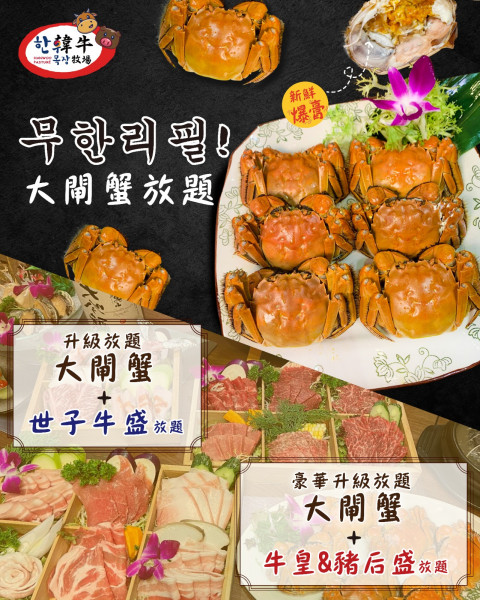 韓國燒肉餐廳推出兩款大閘蟹放題,包括「升級放題 – 大閘蟹 + 世子牛盛放題」和「豪華升級放題 – 大閘蟹 + 牛皇 & 豬后盛放題」,兩款放題的任食時間均為 120 分鐘。除了任食大閘蟹,還有 7 款新鮮海鮮、9 款前菜、 9 款蔬菜、15 款刺身、赤醋壽司,還有免費享有三款極上定量製作刺身及海鮮拼盤。至於韓食方面,則有 8 款韓式主食、韓湯、炒年糕、炒粉絲、辛辣炒魷魚鬚、泡菜豚肉炒飯、東大門炒烏冬和 4 款韓湯。顧客可以任飲汽水,加 $28 可享生啤、燒酒放題,加 $38 可享生啤、燒酒、清酒梅酒放題。