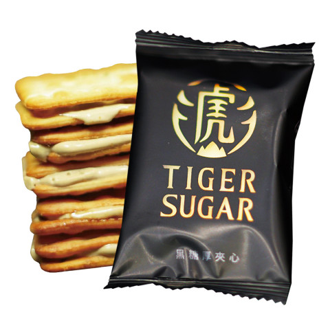 除了珍珠奶茶,老虎堂亦引入風靡台灣的零食—台式黑糖厚夾心餅乾。它是用香蔥梳打餅夾著老虎堂特有的黑糖餡,看上去厚厚的一片,咬落口卻酥脆內軟,交織著鹹鹹的又甜甜的味道,而且香氣濃郁,再配上一杯黑糖波霸鮮奶,下午茶份量剛剛好!台式黑糖厚夾心餅乾現於老虎堂奧海城店、銅鑼灣店、美麗華店優先銷售,每個7元,數量有限,售完即止。
