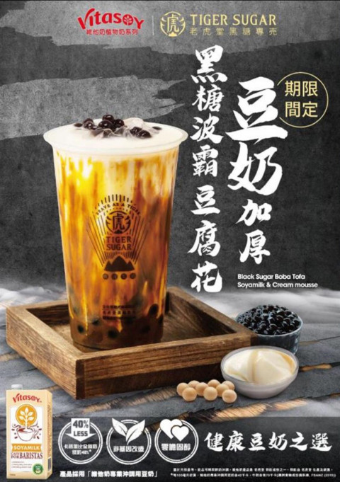 香港老虎堂大部分原材料來自台灣,並經多次研究及調配而成,品質必定有保證!全新豆奶豆腐花系列除了是輕盈健康之選,更照顧蛋奶素食者的需求!其中「黑糖波霸豆腐花豆奶加厚」以維他奶專業沖調用豆奶替代牛奶,不含反式脂肪及膽固醇外,卡路里更比全脂奶低近40%!配上香濃的招牌黑糖 、Q彈波霸珍珠和嫩滑綿軟豆腐花,盡情體驗視覺和味覺的雙重衝擊!