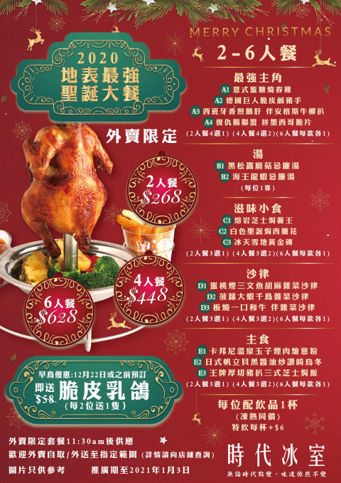 不經不覺抗疫快有一年,對飲食業、尤其是小店帶來致命打擊,所以小編希望大家幫襯小店預訂聖誕、新年大餐,為他們打一打氣!這些小店的套餐都是「大件夾抵食」,例如時代冰室就推出自稱「地表最強聖誕大餐」,主菜包括:意式密糖燒春雞、德國巨人脆皮鹹豬手、西班牙香煎鵝肝伴安格斯牛柳扒、復仇腸聯盟拼墨西哥脆片(4選1),再加飯或意粉或烏冬、配湯、小食、沙律及飲品,兩個人食飽飽!另外12月22日或之前預訂即送脆皮乳鴿(每2位送一隻),隨時宵夜都夠食!但要注意,因為製作需時,所以客人請預先致電店舖查詢 及預訂。另外,時代冰室指「你肯俾錢我肯送!Call車可以到?地方都送!」由店舖代客人call車然後客戶付款就可以了。
