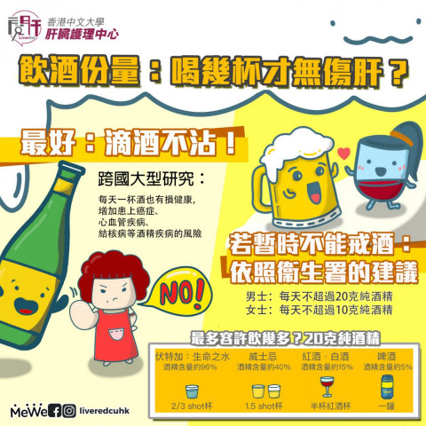 飲酒十分傷害肝臟。酒精的成分是乙醇,乙醇需要靠肝臟進行代謝,而肝臟本身已有許多工作要做,分解酒精只是其中一項任務,所以每次都只能負荷一定含量的酒精。加拿大曾經刊登酒精攝取建議,合理的酒精飲用水平為,女性每周10杯標準份量酒精,每天不超過2杯,而男性每周15杯標準份量酒精,每天不超過3杯。(一杯標準份量酒精,是指341ml啤酒、142ml葡萄酒、86ml甜酒及43ml烈酒) 而香港衞生署更嚴,若要飲用酒精飲料,男士一天不要超過20克純酒精,女士更少,一天不超過10克。換算起來,一罐330毫升啤酒約16克純酒精,一shot 50cc伏特加就約20克。