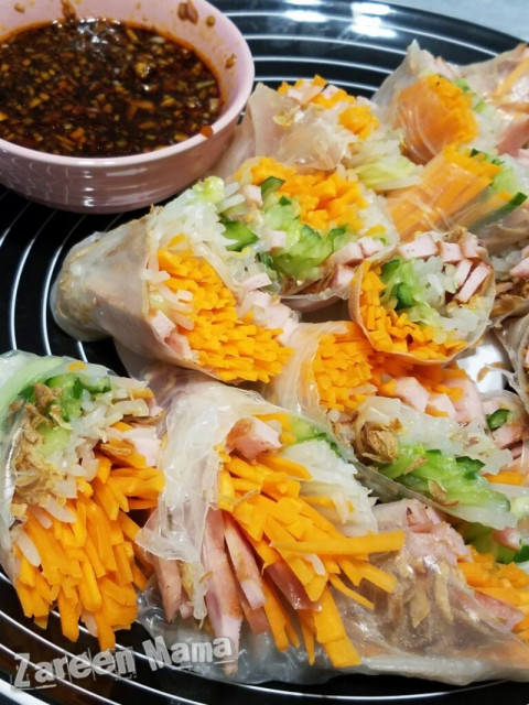 3. 米紙放凍水浸 5 、 6 秒拿起,放上材料,最後加上炸乾蔥,包好切半。醬汁撈好,即成