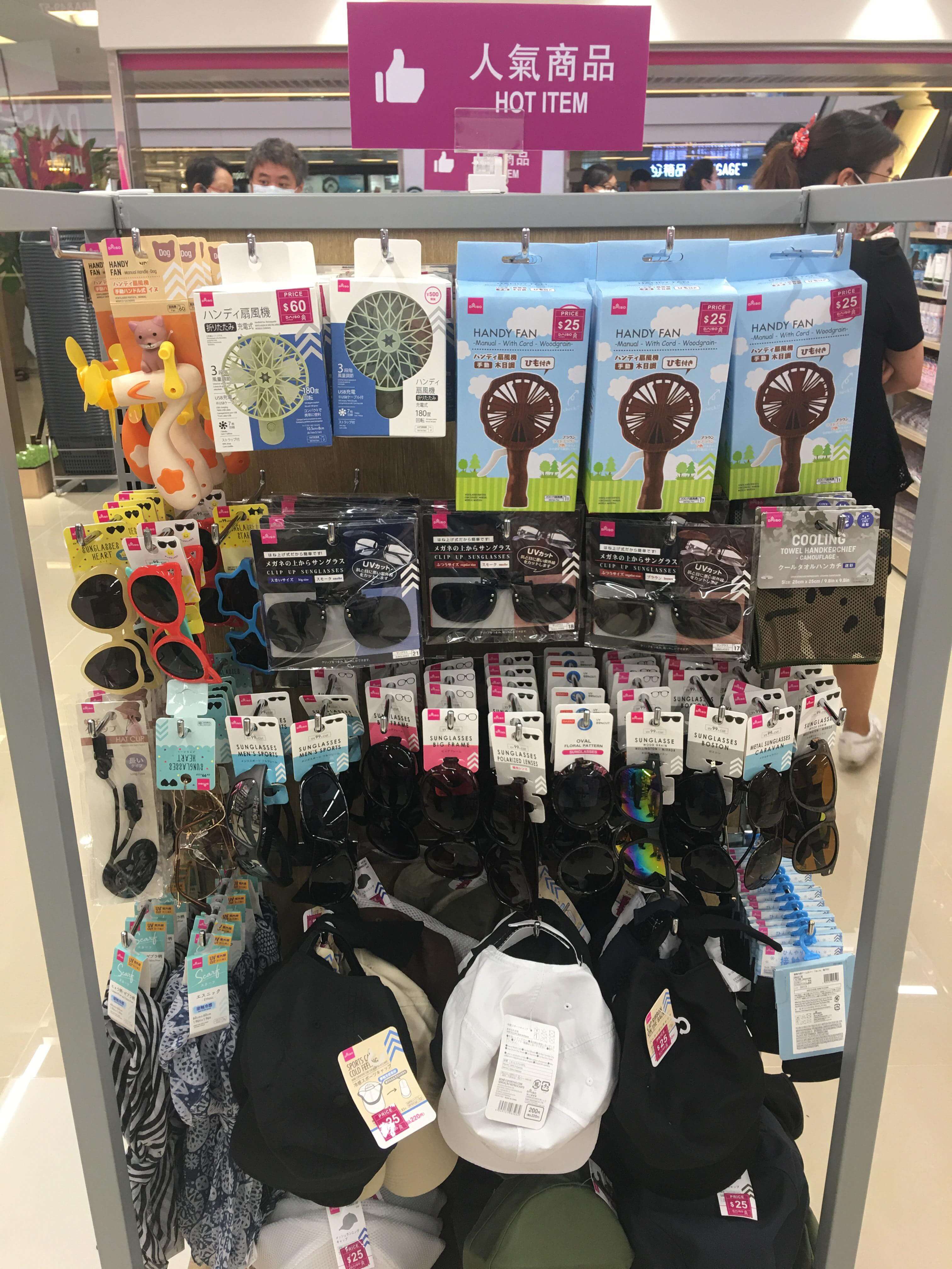 最近天氣炎熱,外出想有效散熱,大人和小童的太陽帽、太陽眼鏡款式齊全。當然,還有每人至少有一把的小型電風扇,備有 25 元和 60 元兩種款式以供選擇。