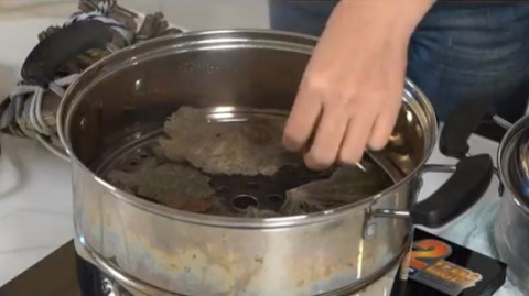2.水滾後把紫蘇葉墊底,大閘蟹肚朝上放進蒸鍋