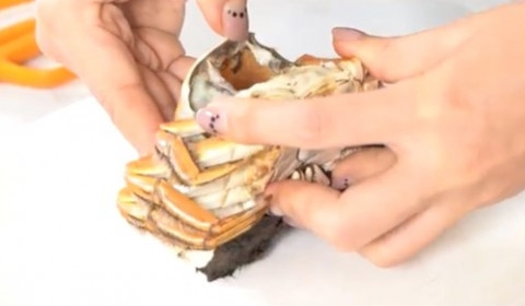 2.把腹部肚臍蓋剝除,在順着蟹背一併剝除蟹殼