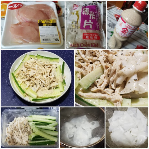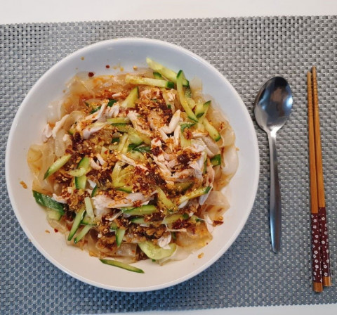 5. 依次放入粉皮、雞絲、青瓜絲,最後淋上醬汁即可