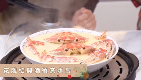 6.花蟹蒸約七成熟後,倒入蛋汁,輕輕用筷子搖一搖花蟹,讓花雕紹興酒、蟹汁跟蛋汁融合,再用文火蒸約 7 – 10 分鐘,香氣撲鼻的花雕紹興酒蟹蒸水蛋便完成。