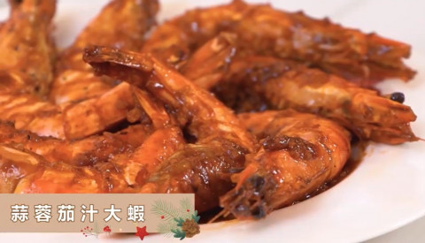 5.再開平底鑊中火,蒜頭爆香,加入步驟 4 的汁醬,將大蝦放入平底鑊,蓋上鑊蓋至汁醬收乾,惹味的蒜蓉茄汁大蝦便完成。
