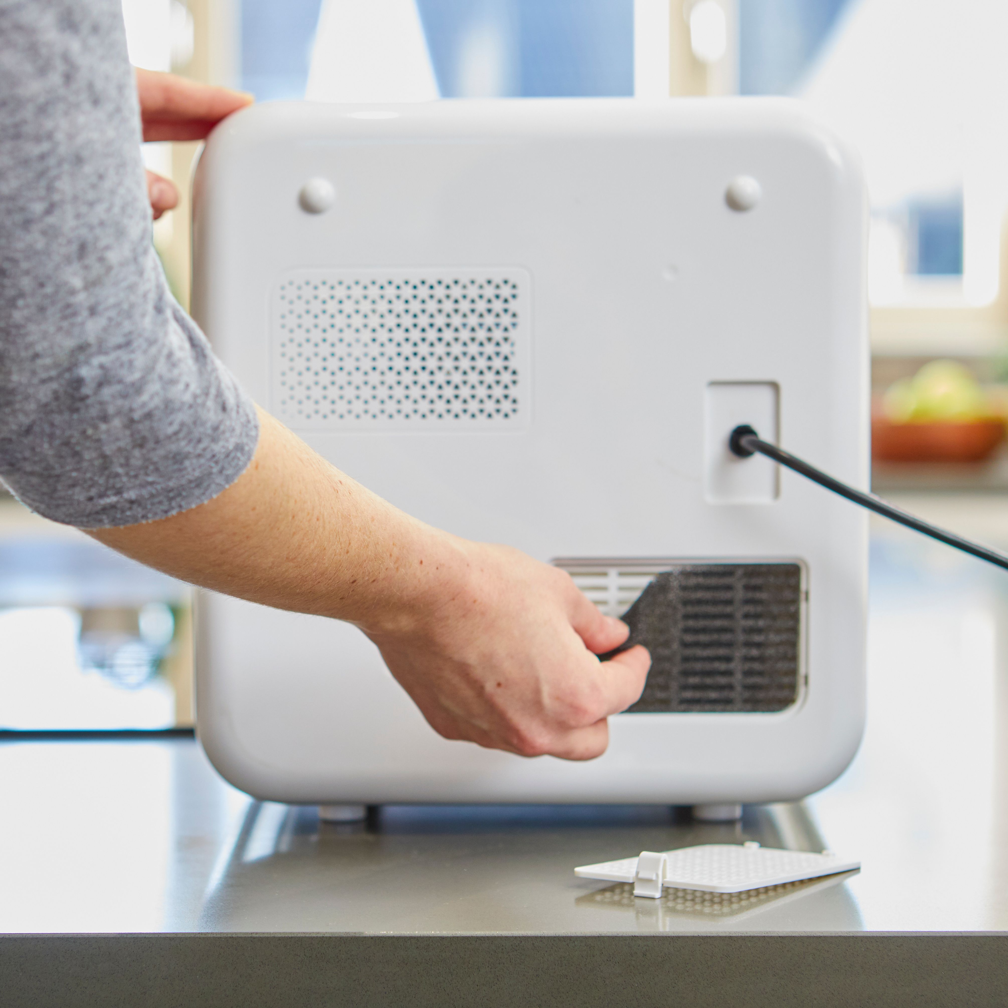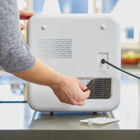 消毒機採用 PM2.5 過濾系統,保持機內潔淨空間。內附的可拆式過濾網,能有效阻隔外在環境有害物質,用溫水清洗便可重覆使用。