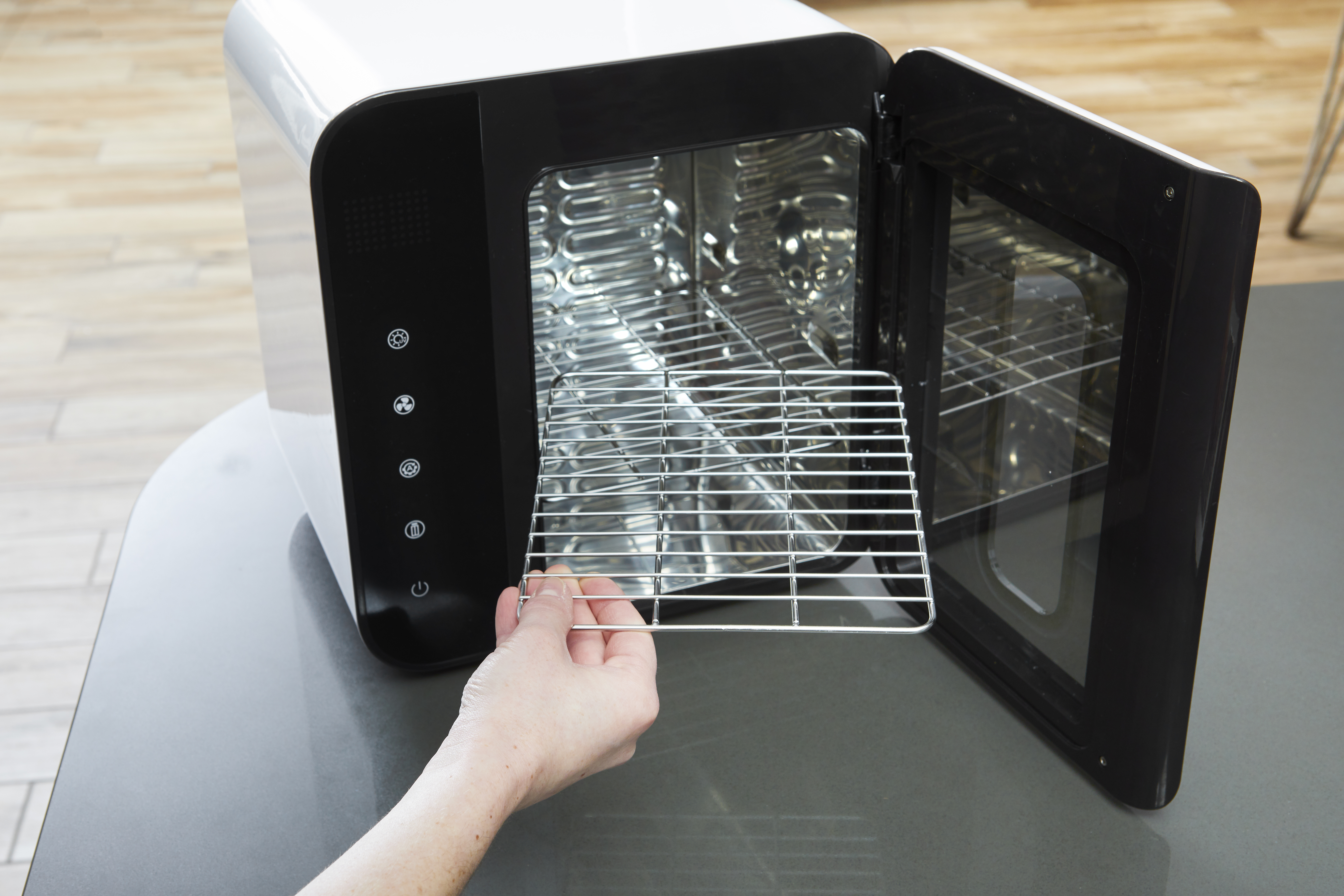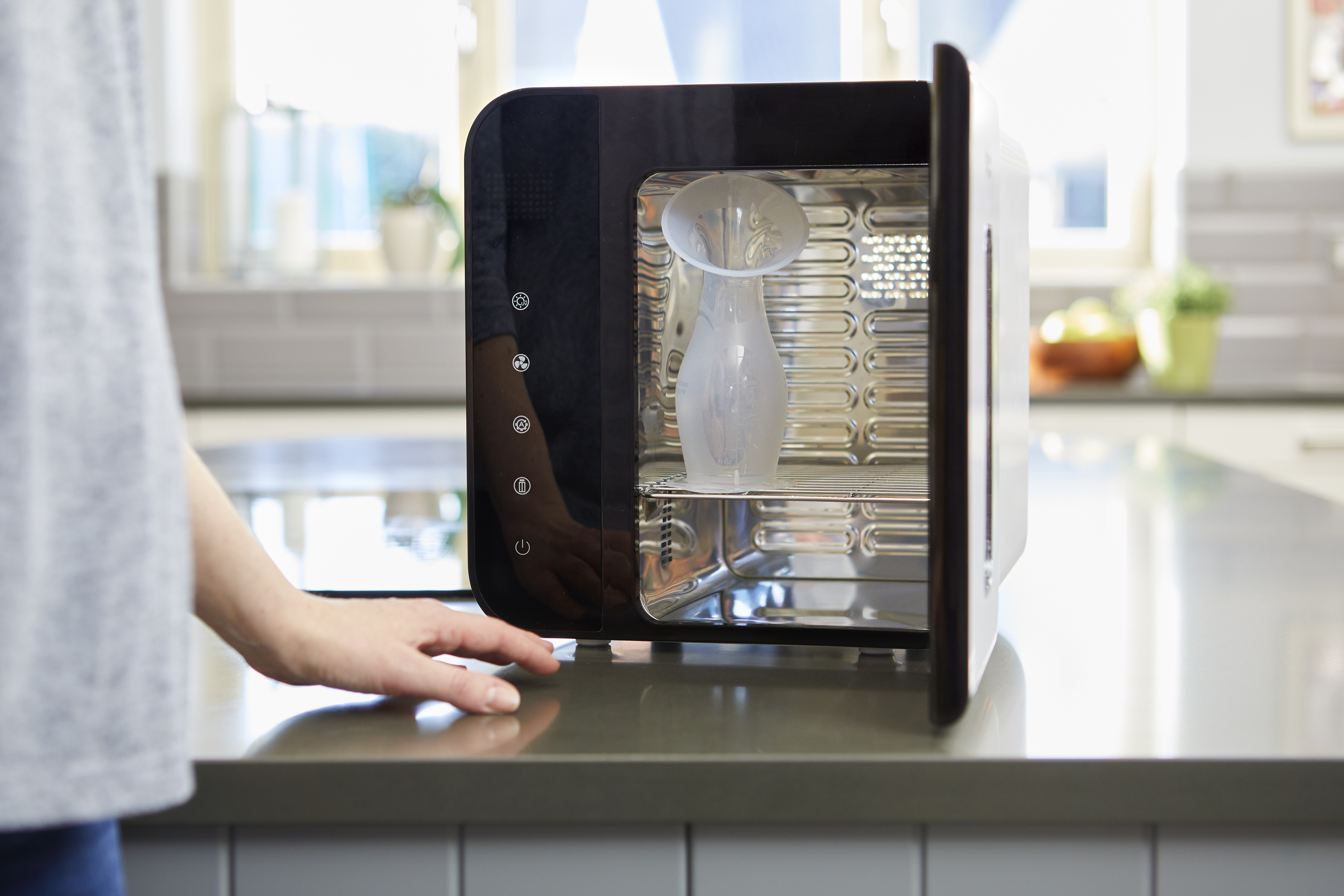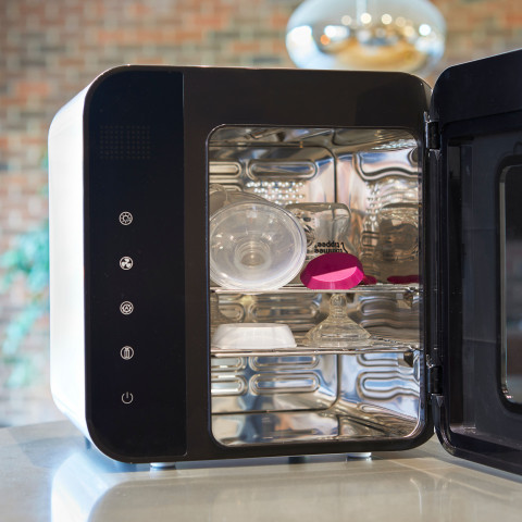 消毒機配有活動層架,可消毒不同大小的物件,例如奶泵、較高身的奶瓶、玩具、牙膠等。